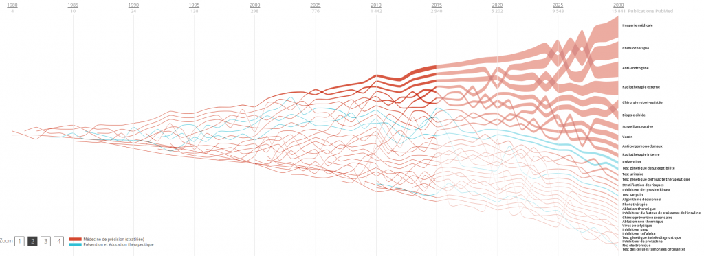 Pour construire l’hôpital du futur, prévoir les dépenses de l’assurance maladie, ou tout simplement repérer les innovations prometteuses dans la prise en charge du cancer de la prostate, l’administrateur général des données et le cabinet La mètis publient une visualisation de données qui montre le volume de publications scientifiques pour 70 innovations depuis 30 ans et prédit les volumes de publications pour les 15 prochaines années.