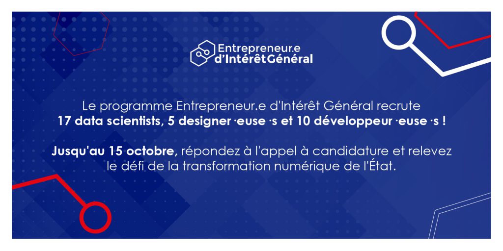 Initié en janvier 2017 par la Présidence de la République, le Programme Entrepreneur•e d’Intérêt Général consiste à recruter pour 10 mois des professionnels aux expertises numériques variées (développement, design, science des données), extérieurs à l’administration, afin de relever des défis liés à l’utilisation des données dans le secteur public et à la transformation numérique de l’État.