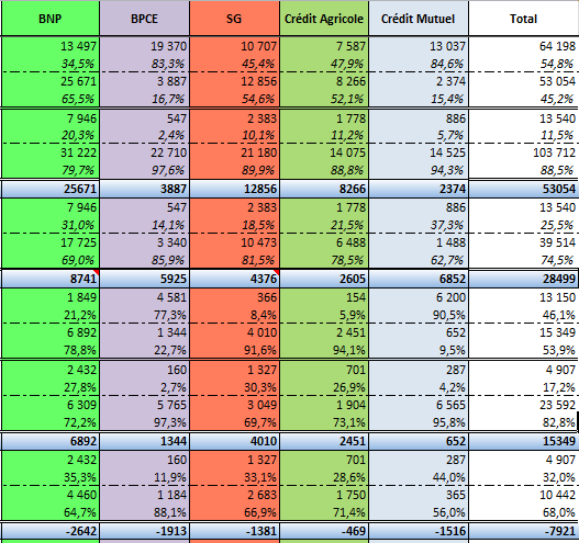 Ces données ont été publiées en 2015 dans leurs documents de référence et rapports financiers annuels de 2014 par les 5 plus grandes banques françaises : BNP Paribas, groupe BPCE, Crédit agricole, Groupe Crédit Mutuel – CIC et Société Générale.