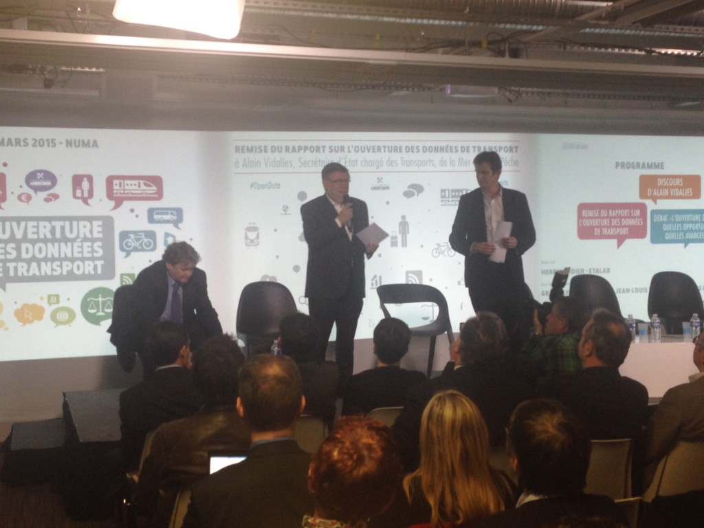 Ce 12 mars 2015, Alain Vidalies, Secrétaire d’Etat en charge des Transports, de la Mer et de la Pêche, a présidé à la remise du rapport sur l’ouverture des données de transportprésenté par Francis Jutand, directeur scientifique de l’Institut Mines-Telecom et vice-président du Conseil national du numérique, qui a présidé les travaux du comité du débat. Cette remise a été suivie d’une table ronde animée par Henri Verdier réunissant des représentants de Jean-Louis Missika, adjoint au maire de Paris et administrateur du STIF, Hervé Groléas, directeur de l’innovation numérique et des systèmes d’information de Lyon Métropole, Alain Pittavino, directeur métier de Transdev et Michaël Thomas, cofondateur de Wehicles.